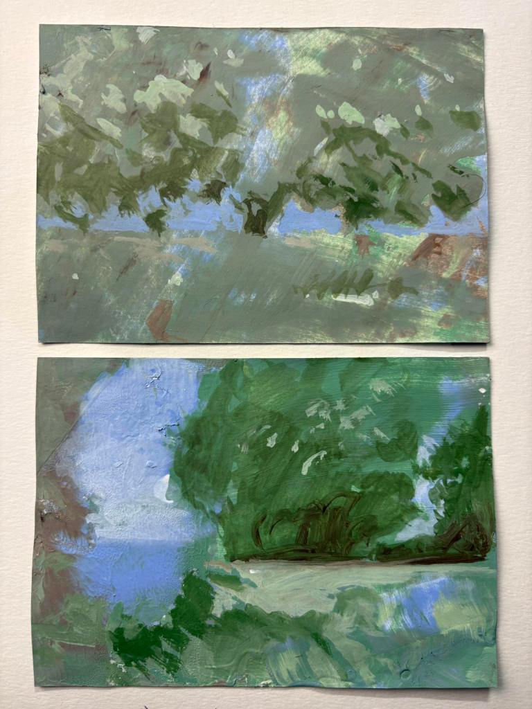 I present two small acrylic landscapes, the result of a fun practice that involves creating shapes by intervening on a random layer of paint, as you can see in this video, organized into steps: first the preparation and choice of colors, then the random application of color on the cards, then viewing the result card by card, and finally the conscious painting on two of the resulting colored cards.