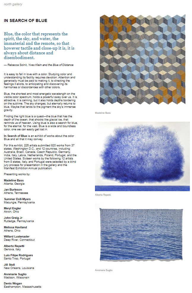 For this exhibit, 225 artists submitted 820 works from 37 states, Washington D.C., and 12 countries, including Australia, Brazil, Canada, Czech Republic, Germany, India, Italy, Latvia, Netherlands, Poland, Portugal, and the United States. Sixteen works by the following 12 artists from 8 states, Italy, and Portugal were selected by a blind jury process for presentation in the gallery and the Manifest Exhibition Annual publication: